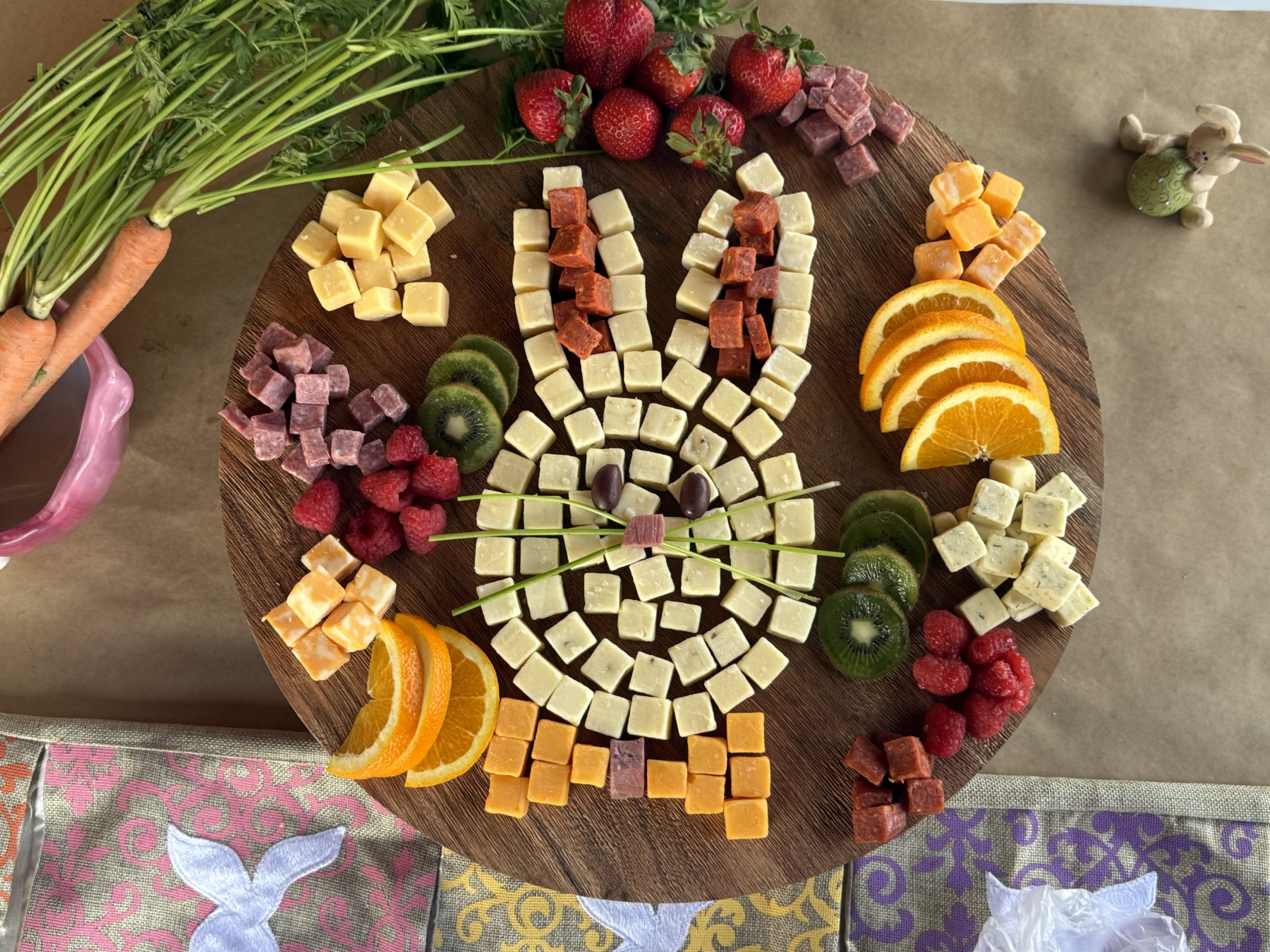 Step 1: Assemble the bunny’s face and ears using a variety Upper Cut Sharp White Cheddar Cheese, Pepper Jack Cheese, and Specialty Assorted Cheese Tray.