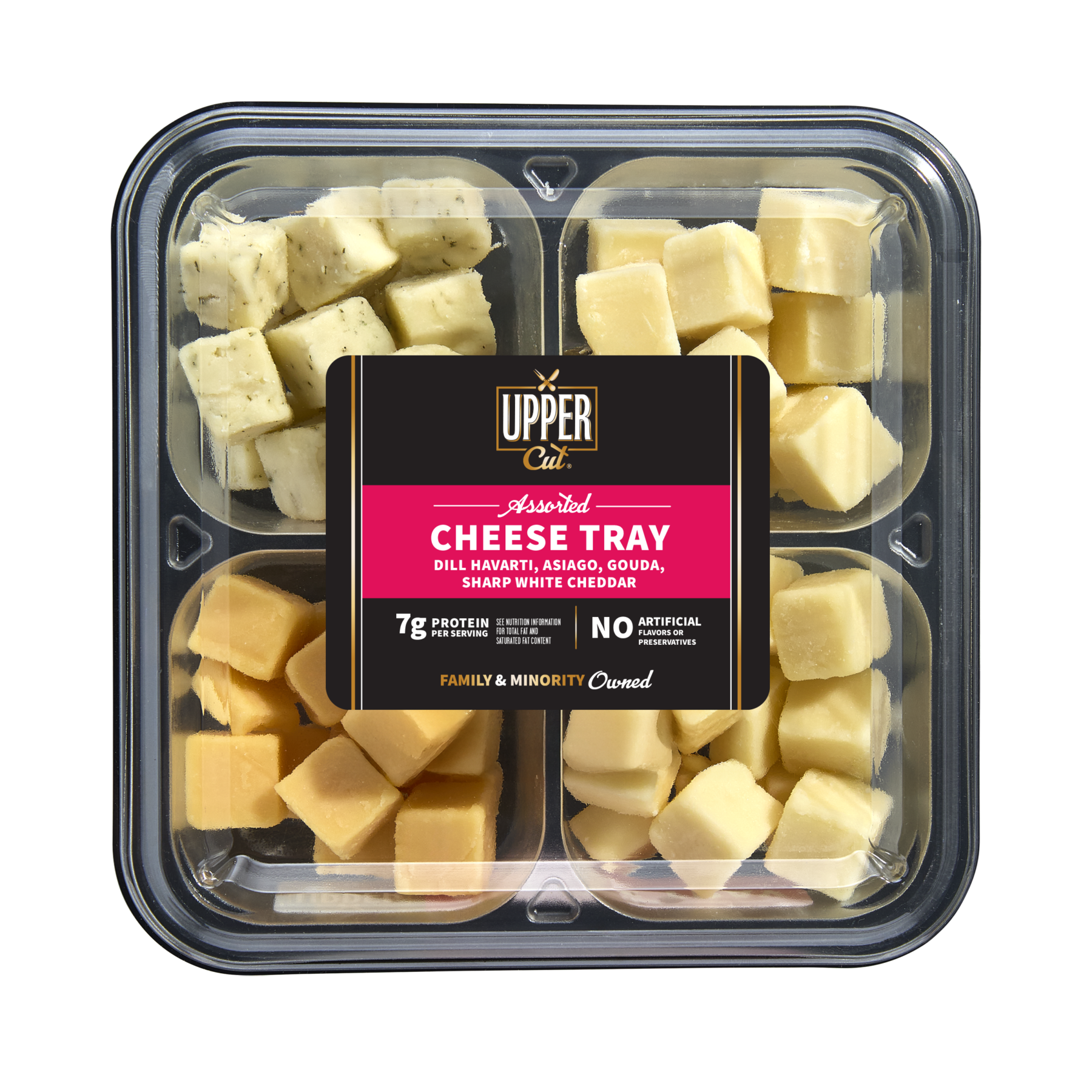 Upper Cut Specialty Assorted Cheese Tray brings together four flavorful favorites, Dill Havarti, Asiago, Mild Gouda, and Sharp White Cheddar. Each cubed for easy serving and snacking, this convenient 4-compartment tray is perfect for adding easy variety to your charcuterie board, meal prepping, or workday snacking.