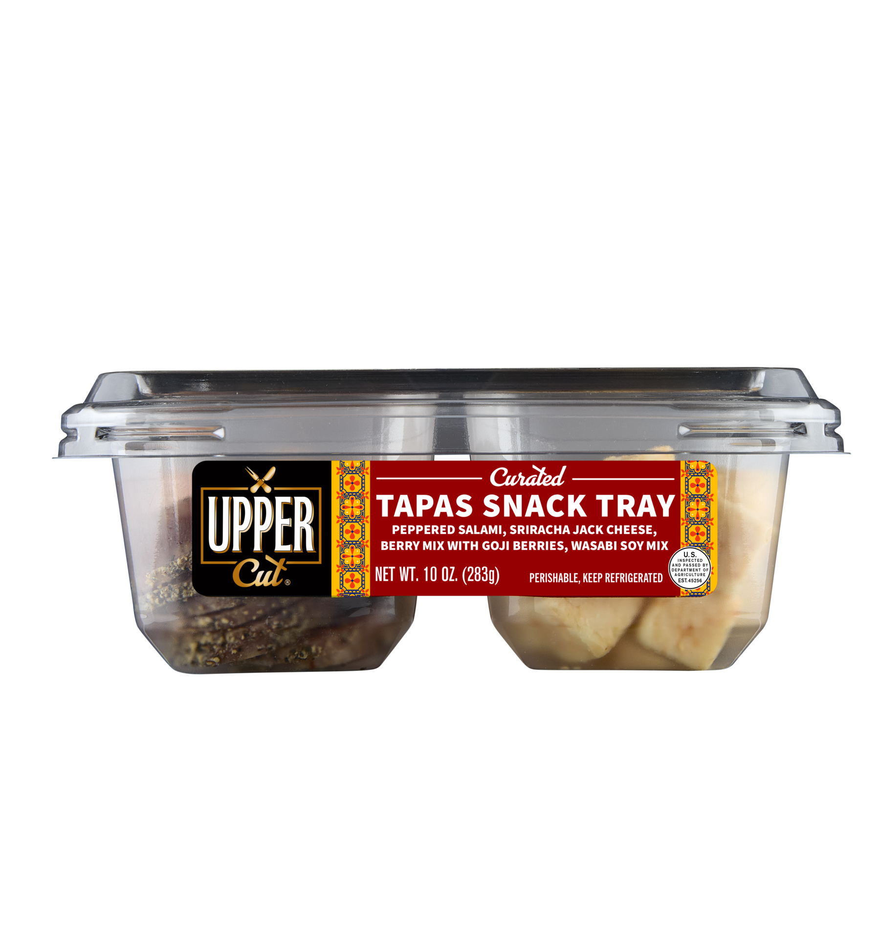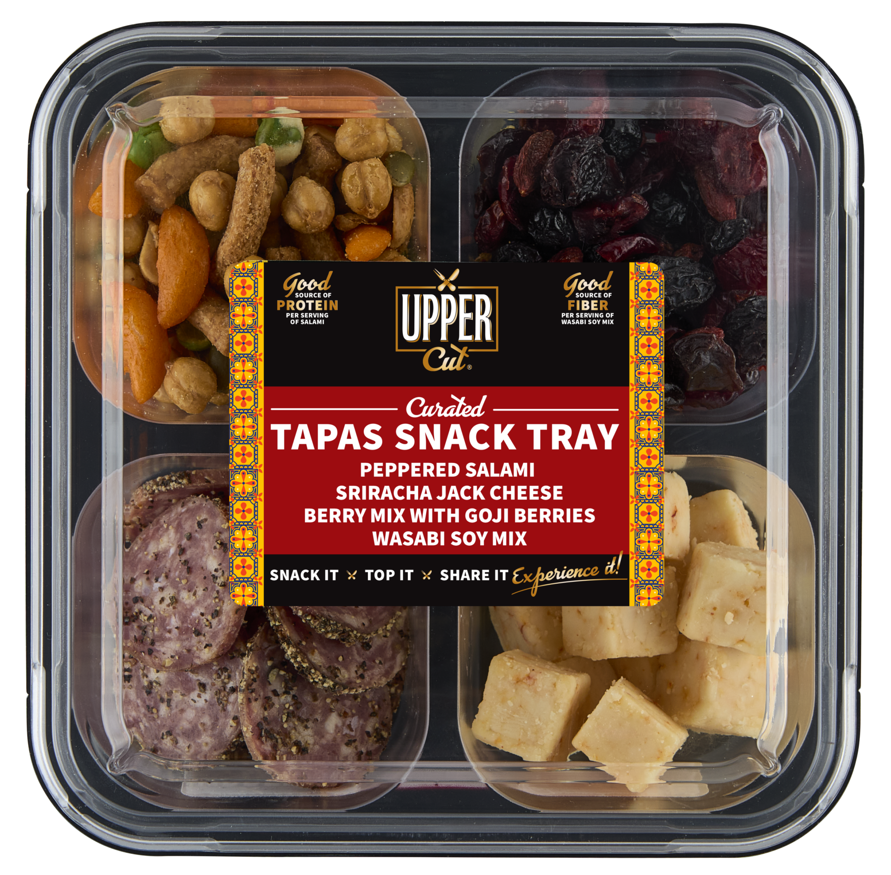 Peppered Salami, Sriracha Jack Cheese, Berry Mix with Goji Berries, Wasabi Soy Mix 10 oz (283g) | 18g Protein per ContainerTurn up the flavor with the Upper Cut Curated Tapas Snack Tray. This bold combination brings together zesty peppered salami, spicy Sriracha Jack cheese, a sweet berry mix with goji berries, and a crunchy wasabi soy blend. Perfect for adventurous snackers, this tray delivers a satisfying balance of heat, sweet, and crunch, all in a convenient, ready-to-enjoy package. Snack boldly, savor easily.