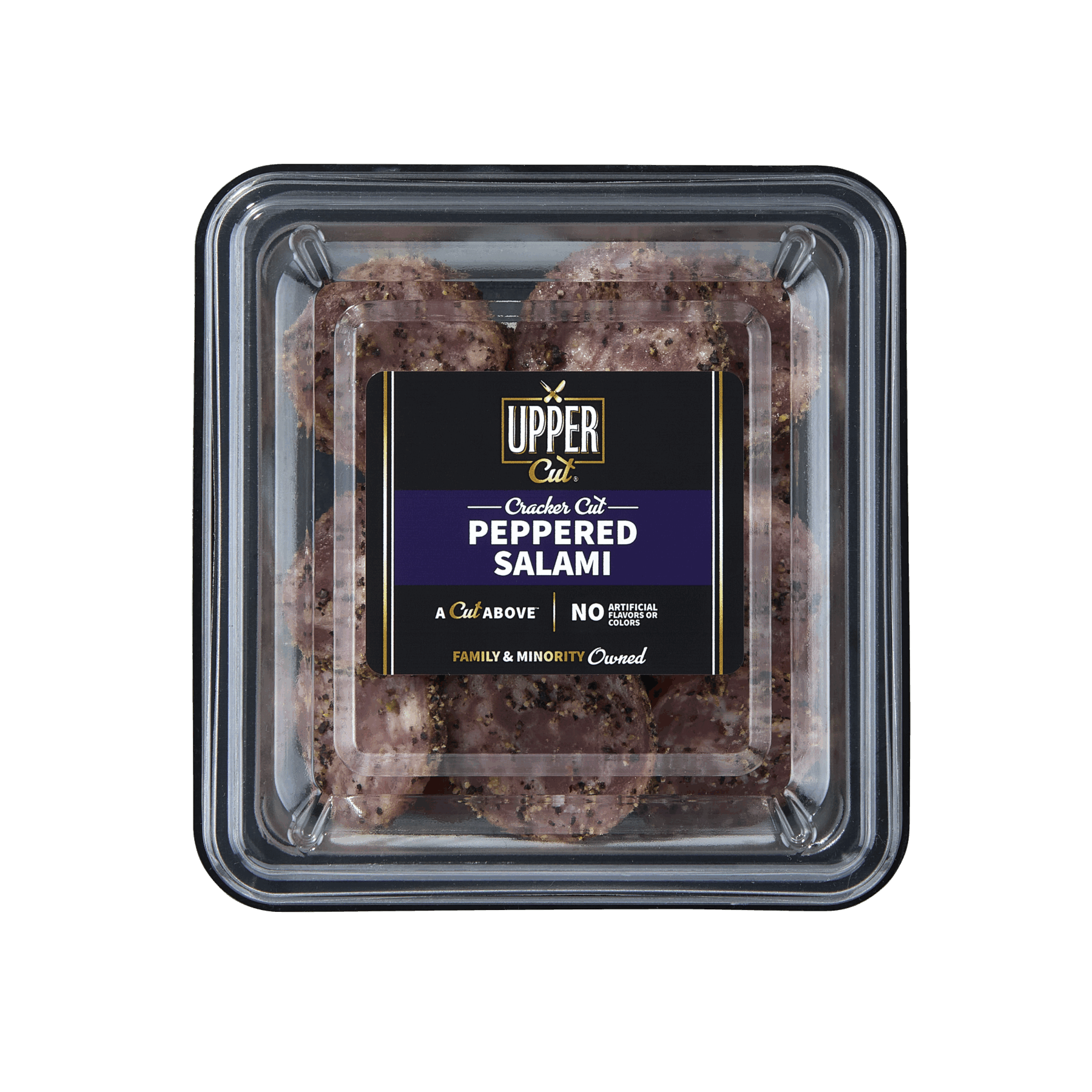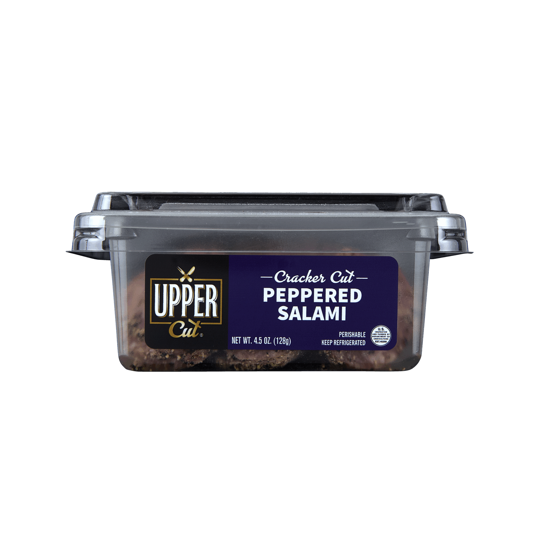 4.5 oz (128g) | 4.5 servings | 31.5g protein per containerOur Peppered Salami features a robust, savory base of pork beef, sea salt, and spices, wrapped in a bold layer of cracked black peppercorns for a distinctive, spicy kick. This cured and dried sausage offers a firm yet sliceable texture, perfect for charcuterie boards, sandwiches, or snacking.