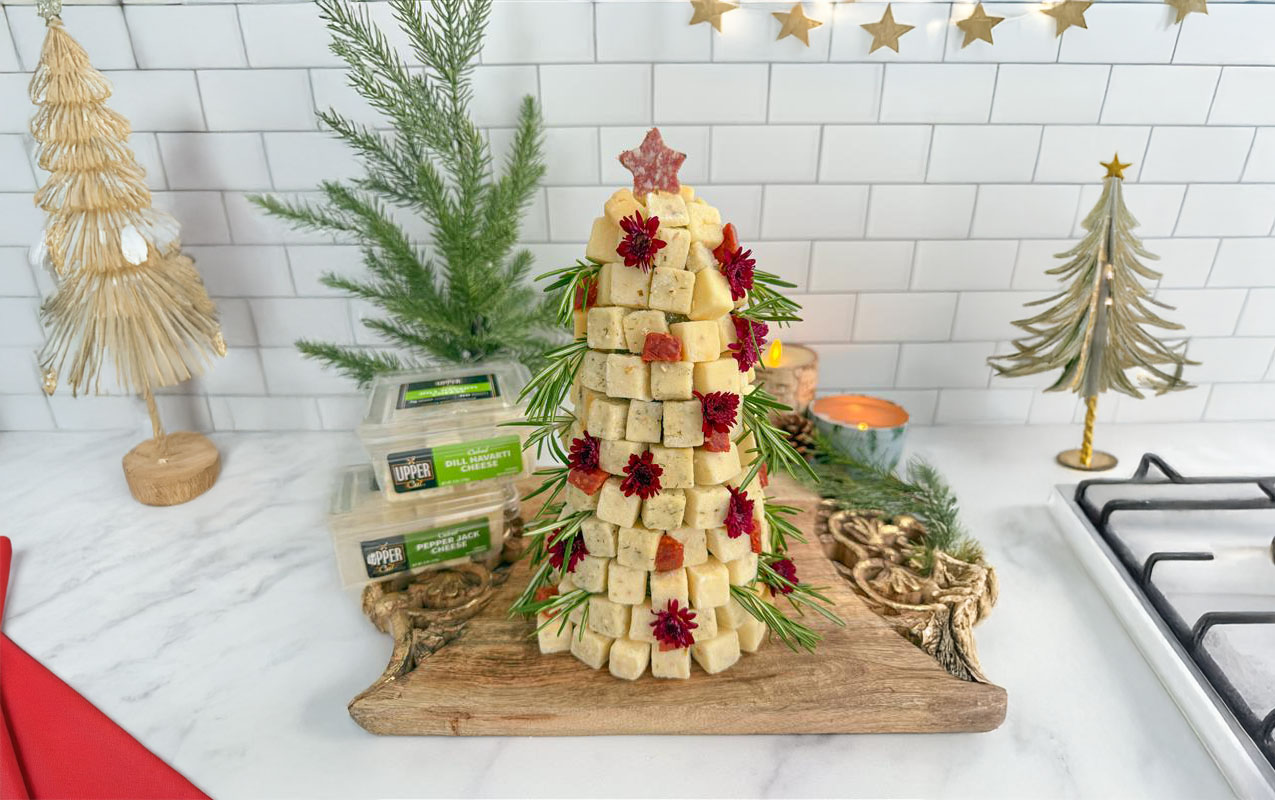 Ever tried turning cheese into a Christmas tree? I give you the Cheese-mas Tree. I grabbed a floral cone, wrapped it in plastic wrap, and started building. I used Upper Cut’s cheese cubes that were already perfectly cubed, which made this so easy. A few toothpicks, some Upper Cut pepperoni ‘ornaments,’ and a salami star on top … and boom … your new favorite holiday centerpiece. Enjoy.